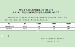 雅安市名山區(qū)茶城建設(shè)工程有限公司系雅安市名山區(qū)區(qū)屬一級國有企業(yè),成立于2018年,注冊資本2億元,主要經(jīng)營范圍為對土地、城市資源等領(lǐng)域及保障性住房、房地產(chǎn)開發(fā)、城市基礎(chǔ)設(shè)施、公共服務(wù)設(shè)施等進(jìn)行經(jīng)營管理;并開展項目投資、工程管理服務(wù)及園林綠化、環(huán)境治理、土地整理等各類工程建設(shè)活動。根據(jù)公司2022年人員招聘計劃,茶城公司及全資子公司擬面向社會公開招聘高校畢業(yè)生3名(含2020年、2021年未就業(yè)高校畢業(yè)生和2022年應(yīng)屆高校畢業(yè)生。特別說明:“未就業(yè)高校畢業(yè)生”需同時滿足以下條件:拿到畢業(yè)證和學(xué)位證;在規(guī)定擇業(yè)期內(nèi)沒有與任何單位簽訂任何形式的勞動合同...