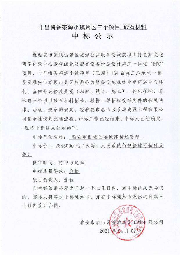 十里梅香茶源小鎮(zhèn)片區(qū)三個項目砂石材料中標公示